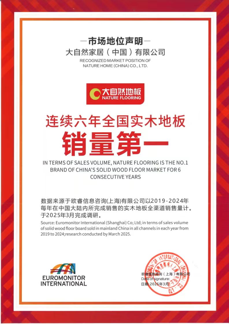 根據(jù)市場權(quán)威數(shù)據(jù)印證了這一戰(zhàn)略成效:歐睿國際2024年度報告顯示,大自然實木地板連續(xù)6年(2019-2024)榮膺“全國實木地板銷量第一”和“全球?qū)嵞镜匕邃N量第一”的榮譽(yù),這一成就詮釋了商業(yè)價值與生態(tài)價值協(xié)同共生的典范。