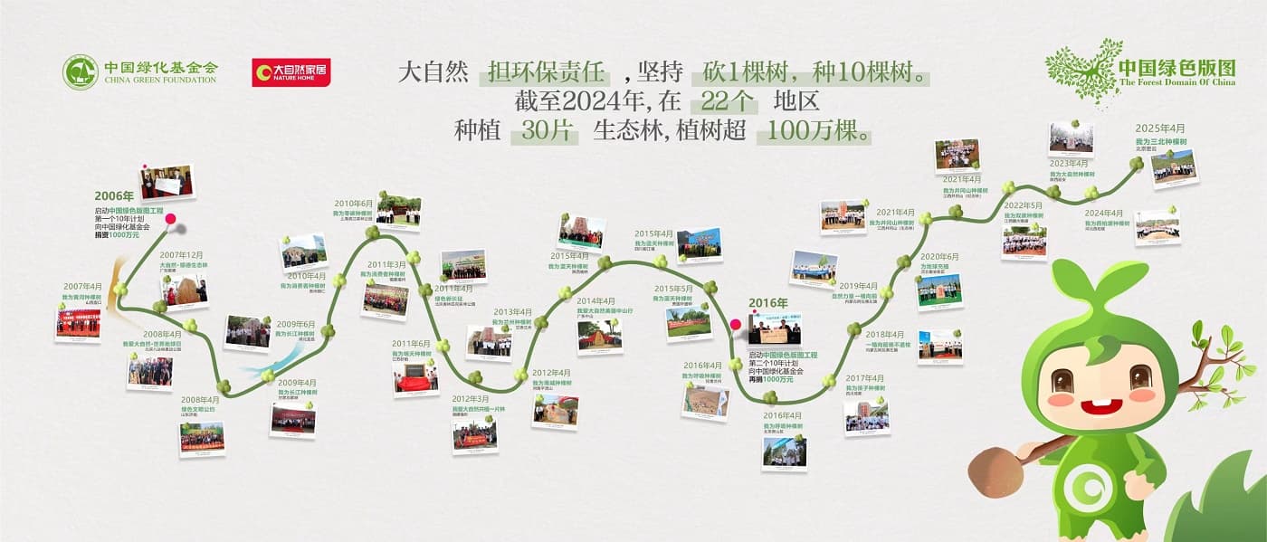 自“中國綠色版圖”工程啟動以來,大自然家居董事長佘學(xué)彬提出的“砍一棵樹,種10棵樹”理念在20年間持續(xù)踐行,以長期堅守為指引,積極推動行業(yè)走向商業(yè)向善的可持續(xù)發(fā)展道路,并帶動更多人加入守護(hù)環(huán)境、共創(chuàng)綠色未來的行列。