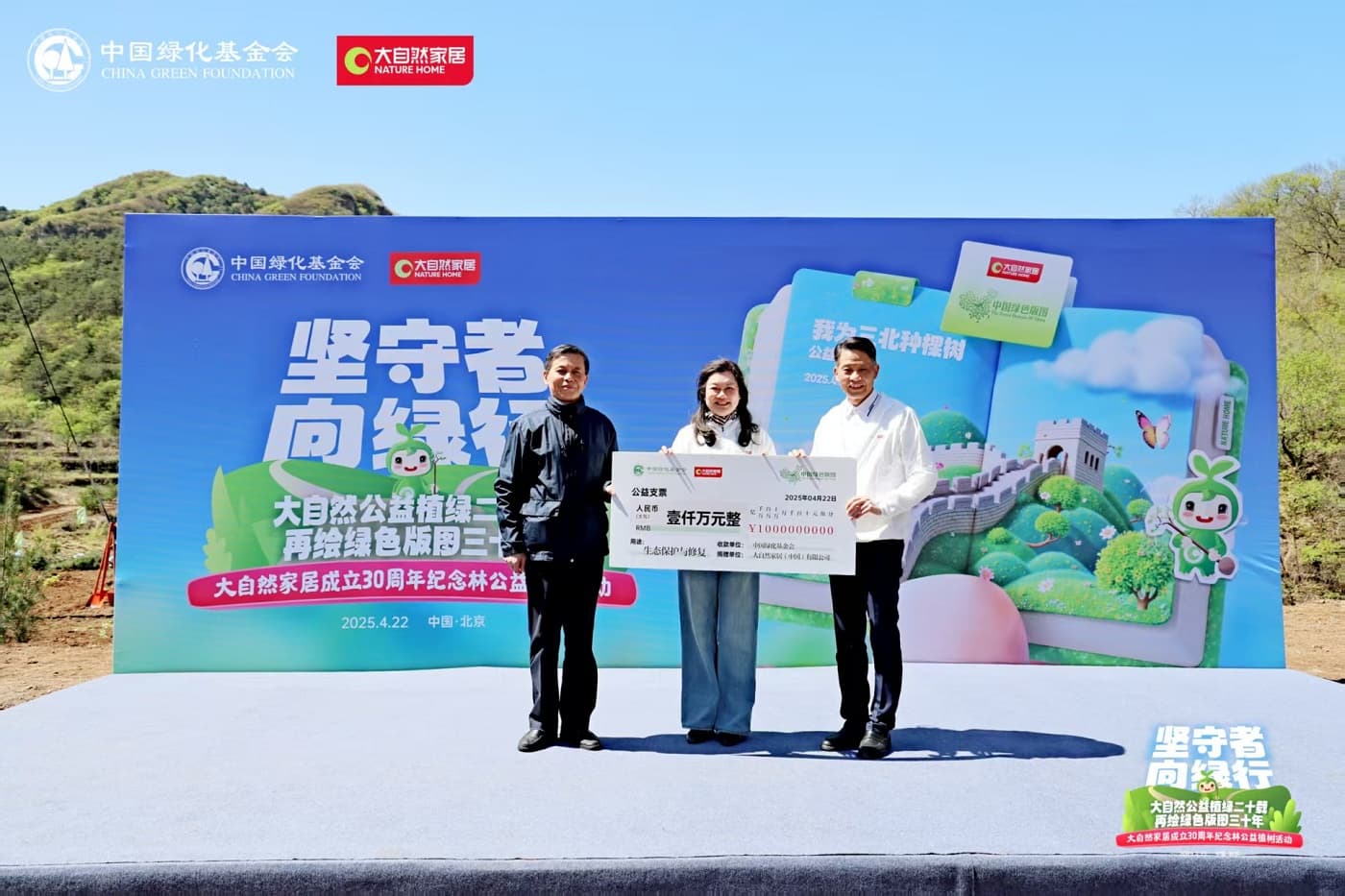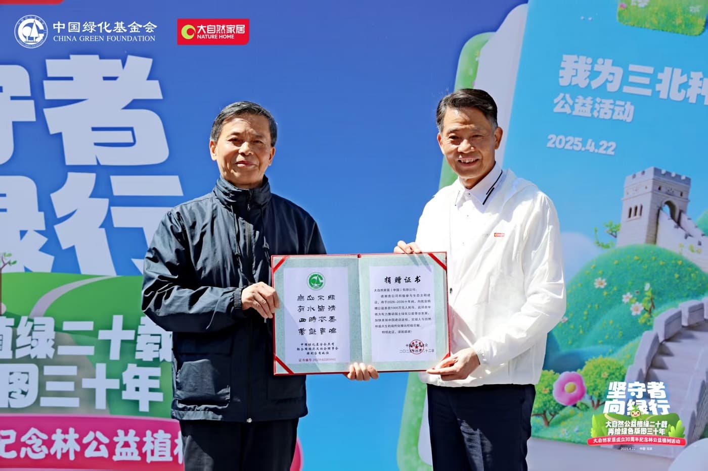 中國綠化基金會主席陳述賢與大自然家居董事長佘學(xué)彬共同啟動了“中國綠色版圖”第三個10年計劃。未來十年,大自然家居將繼續(xù)攜手中國綠化基金會,聚焦生態(tài)修復(fù)、城市碳中和林建設(shè)等生態(tài)工程,推動植樹行動從規(guī)?;炝窒蚓珳?zhǔn)化、科學(xué)化生態(tài)治理轉(zhuǎn)型,助力國家“三北”防護(hù)林工程與碳中和目標(biāo)。